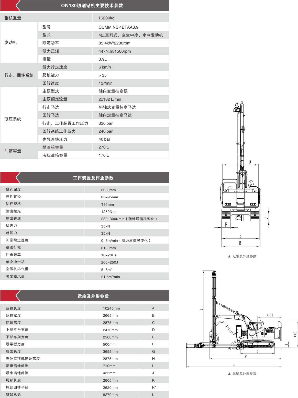 3.可进行切削和冲击作业,普氏系数f≤8的各种岩层适宜用切削钻孔作业,普氏系数8<f≤10的各种岩层适宜用冲击钻孔作业。