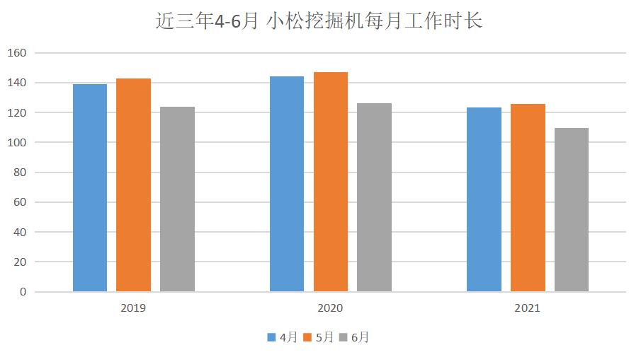 说明一点,我们为什么要拿2019年的数据,与2021年4-6月的挖机工作时长相比较呢?原因大家应该都知道,因为2020年上半年的情况特殊,前几个月因为新冠疫情的肆虐,2020年1-3月的挖机开工小时数是非常低的,到了4月份,随着整个中国社会的大复工,工程机械迎来了购机狂潮,而且2020年四五月的挖机开工小时数屡创新高,其中2020年5月的开工小时数达到147.2小时,为历年最高的。鉴于此,2019年的数据具有一般代表性,更真实一些。