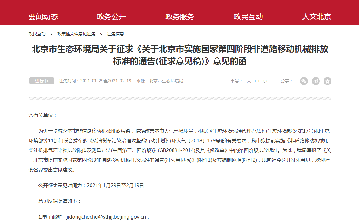 北京拟于2021年12月1日提前实施国家非道路国四排放标准